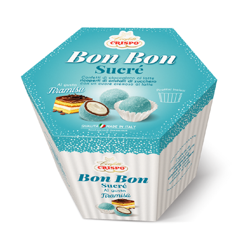Confetti di cioccolato al latte ricoperti di cristalli di zucchero con un cuore cremoso al latte al gusto di Tiramisù.