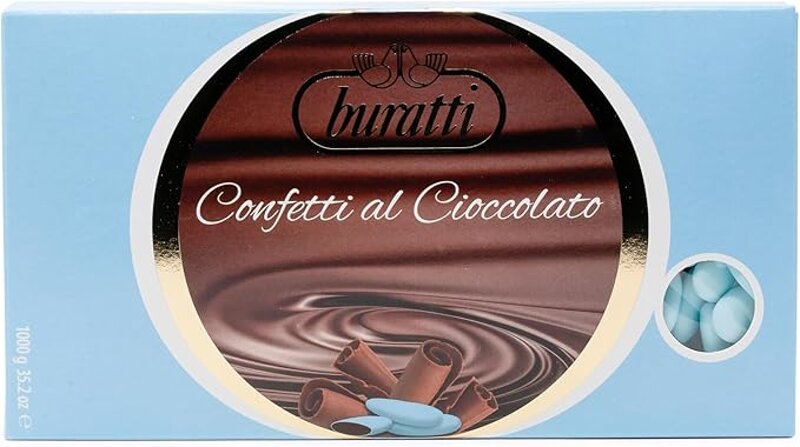 Finissimi confetti con un cuore di cioccolato fondente, di colore azzurro