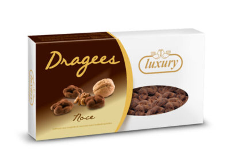 Raffinate noci ricoperte di cioccolato fondente tartufato. Confezione da 0,5 kg. Gluten free.